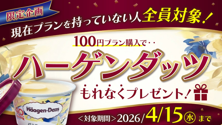 【4月15日(水)までの期間限定】100円プラン購入者に、もれなくハーゲンダッツをプレゼント
