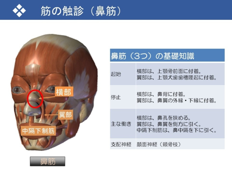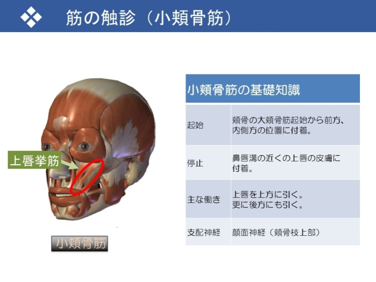 - 表情筋の起始・停止を把握しながら、主要な顔面筋の触診とアプローチを実践できる