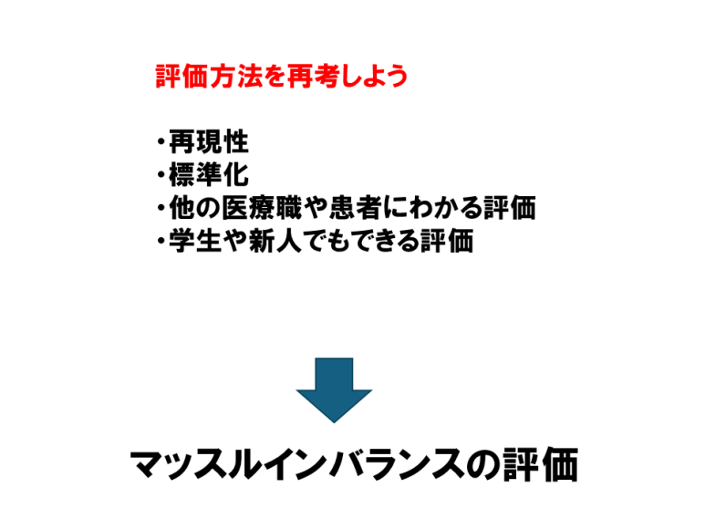 理学療法は標準化された再現性のある評価方法が必要でありまた特殊な技術や難しい手技ではなく新人でもできる標準的で再現性のあるアプローチが必要である。