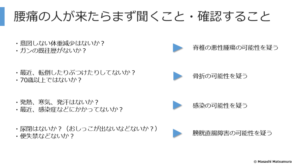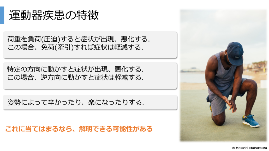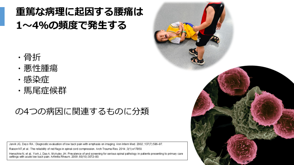 腰痛において最も重要となるred flagsの考え方について、「腰痛の原因が腎臓癌だった症例」を例に取り上げ、どのような違和感に気づき、どのようにエビデンスをもとに臨床判断を行うのかを示します。また、red flagsのない腰痛に対しては、評価結果をどのように統合し、介入方針を立てていくのかを解説します。
